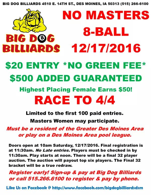 $500 added GUARANTEED. Doors open at 10am Saturday 12/17/2016. Final registration is at 11:30am. No late entries. Play starts at noon. There will be a final 32 auction. The auction will payout top 6 players. The final 32 bracket will be a true redraw. PLEASE SEE THE ATTACHED FLYER!