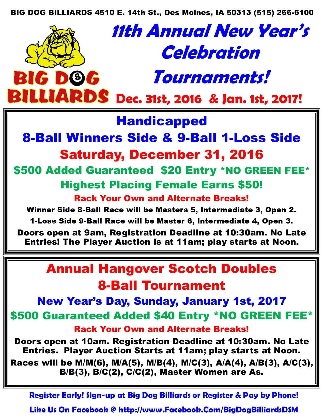 | 12/31/16 | 12:00pm | Both | 8-ball | | $500.00 | $20.00 | | Double | 34 |