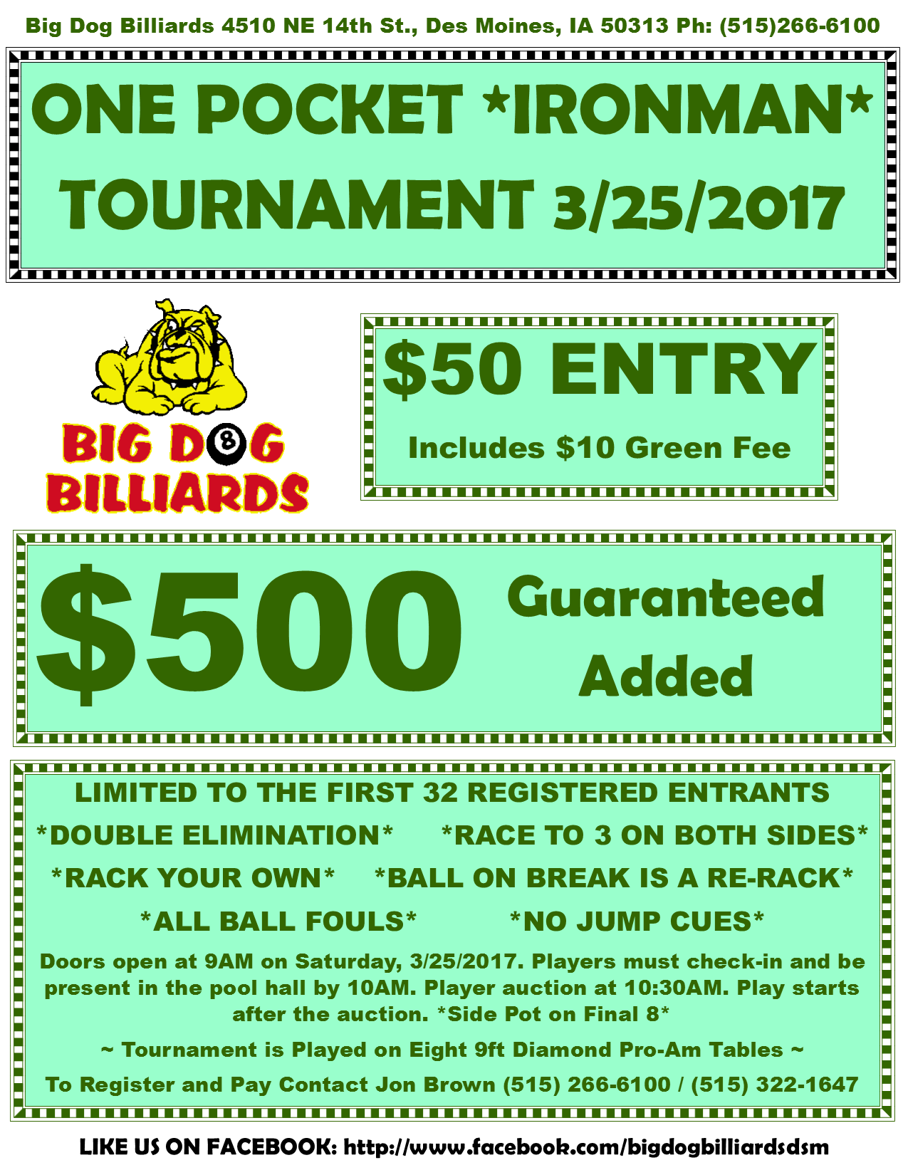 | 03/25/17 | 10:00am | Both | One Pocket | | $500.00 | $50.00 | | Double | 2 |