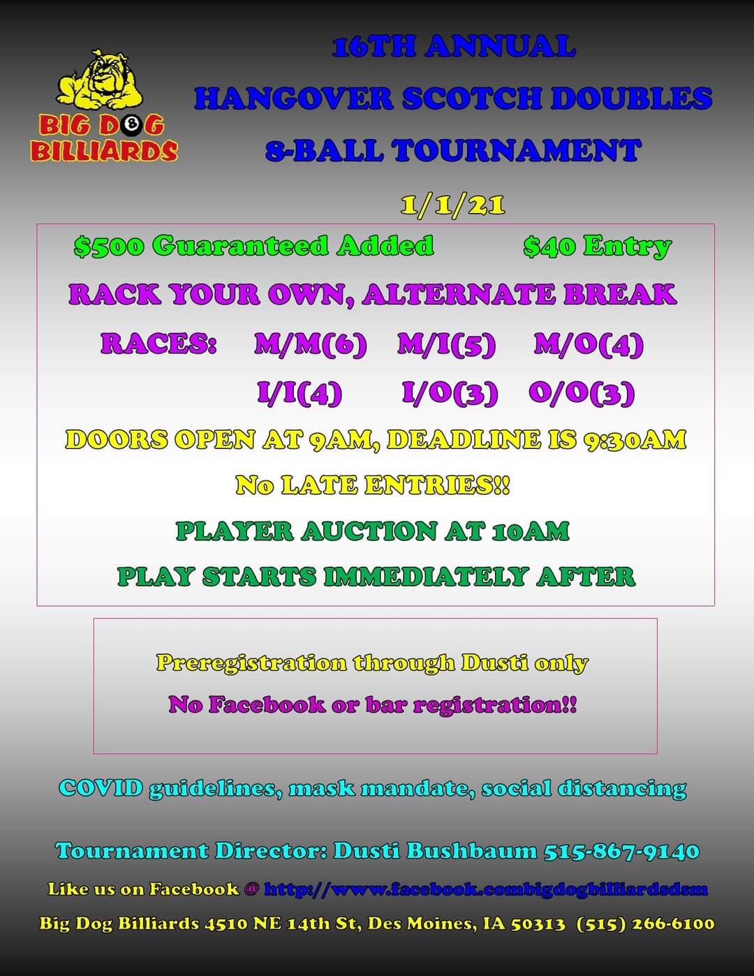 | 1/1-01/02/21 | 10:00am | Both | 8-ball | | $500.00 | $40.00 | | Double | 53 |