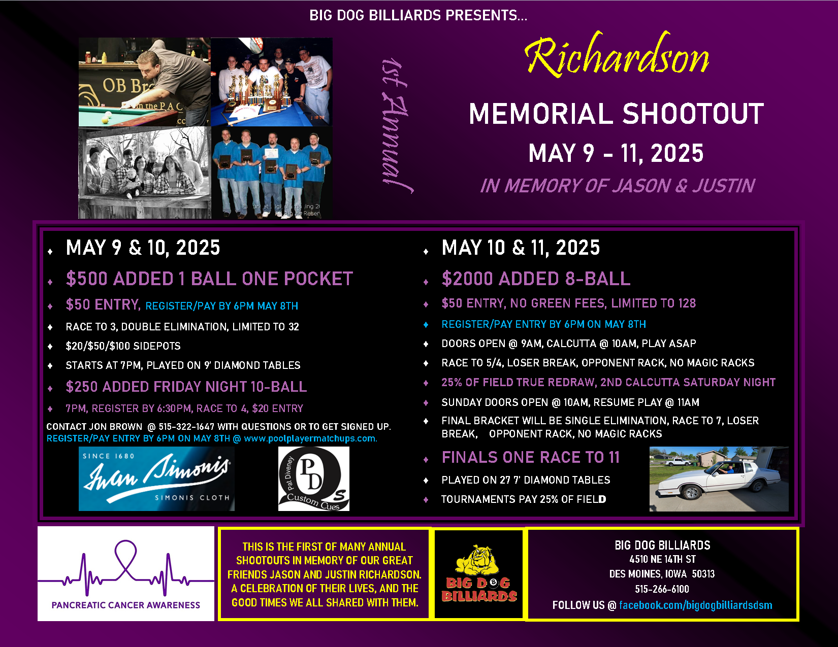 | 05/09/25 | 7:00pm | Both | One Pocket | | $500.00 | $50.00 | Race to 3, Race to 3 (Advanced) | Double | 20 |