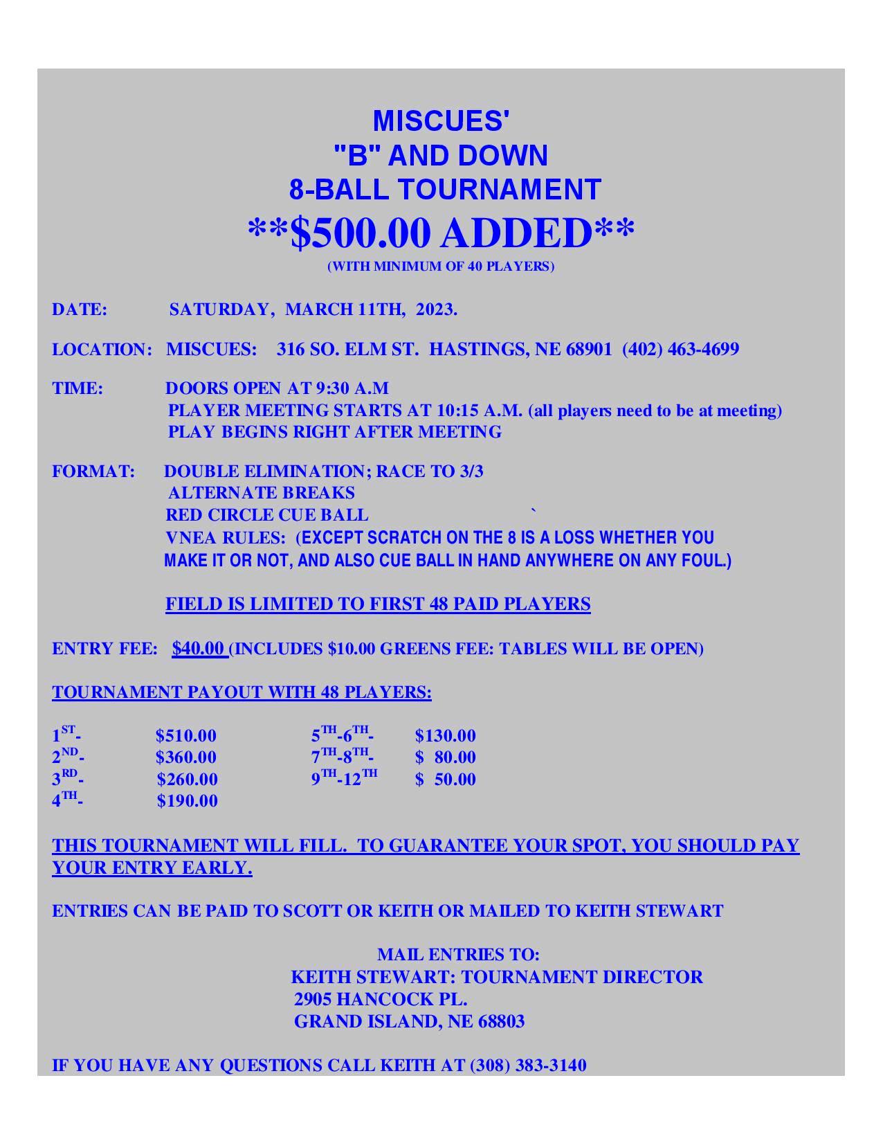 MISCUES "B" & DOWN 8-BALL TOURNAMENT