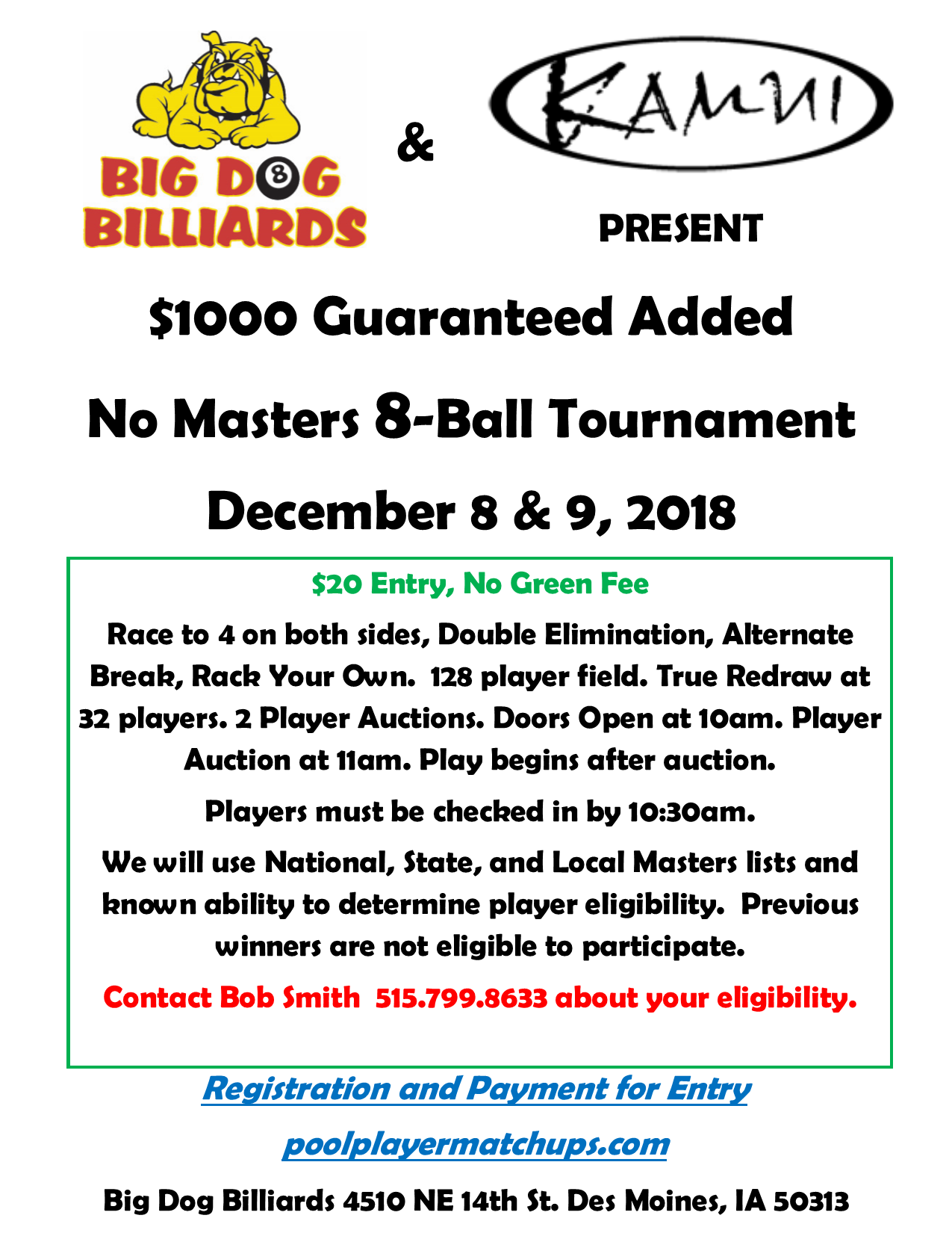 $1000 added- To enter: call Bigs Dogs (# above) or Bob at 515-779-8633 and give your name, city/state, and phone number. Bob or Desiree will register approved players. Once you are registered then you will be able to pay through Poolplayermatchups by clicking on the "Pay" link next to your registered player name. Follow the blue date link below to view the registered players and pay your entry fees.