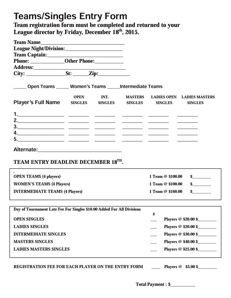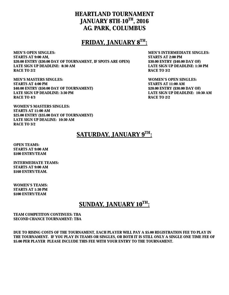 Heartland Tournament January 8-10th, 2016 at Ag Park in Columbus. All singles divisions will begin and end on Friday. All teams will start on Saturday morning and end on Sunday. ***Due to rising costs of the tournament, each player will pay a $5.00 registration fee to play in the tournament. If you play in teams or singles, or both it is still only a single one time fee of $5 per player. Please include this fee with your entry to the tournament.***