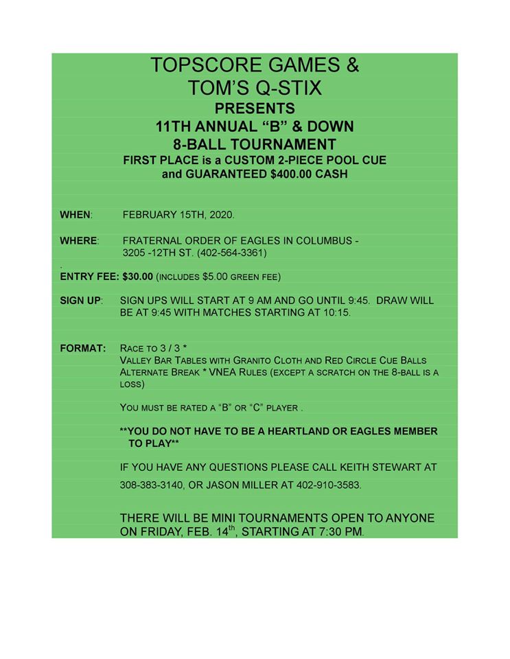 | 02/15/20 | 4:00am | Both | 8-ball | B And Down 2nd Chance 2020 | $0.00 | $15.00 | | Single | 20 |